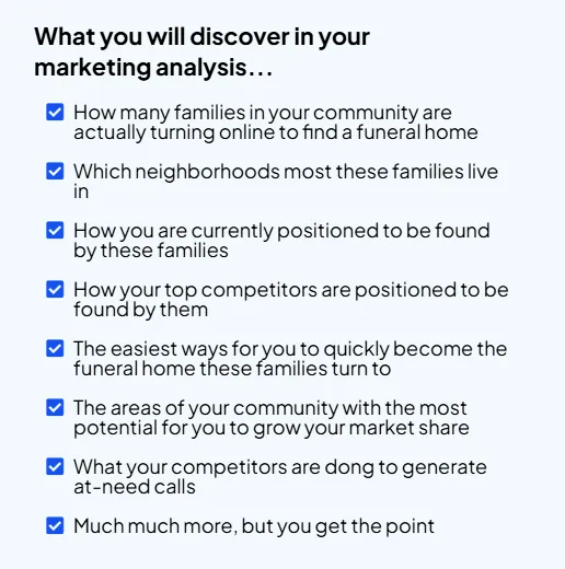 We’ll run a 17-point audit and analysis of your funeral home and community to identify the easiest ways for your funeral home to capture more market share.